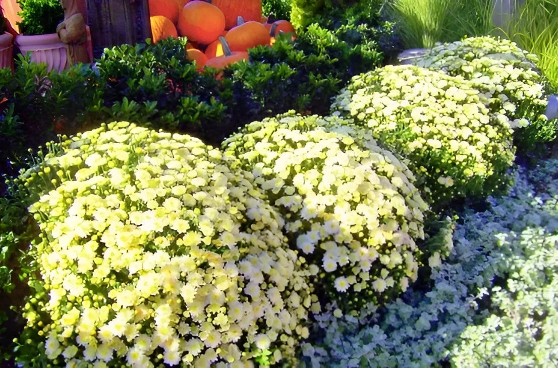 Large mounds of white mums are artfully arranged to make a visual impact in fall gardens. To add curb appeal, use just one color, such as with these creamy white mums. Count on at least four weeks of blooms, but they could possibly last longer if you deadhead spent blooms. Mums will bloom again for another spectacular showing in the spring.