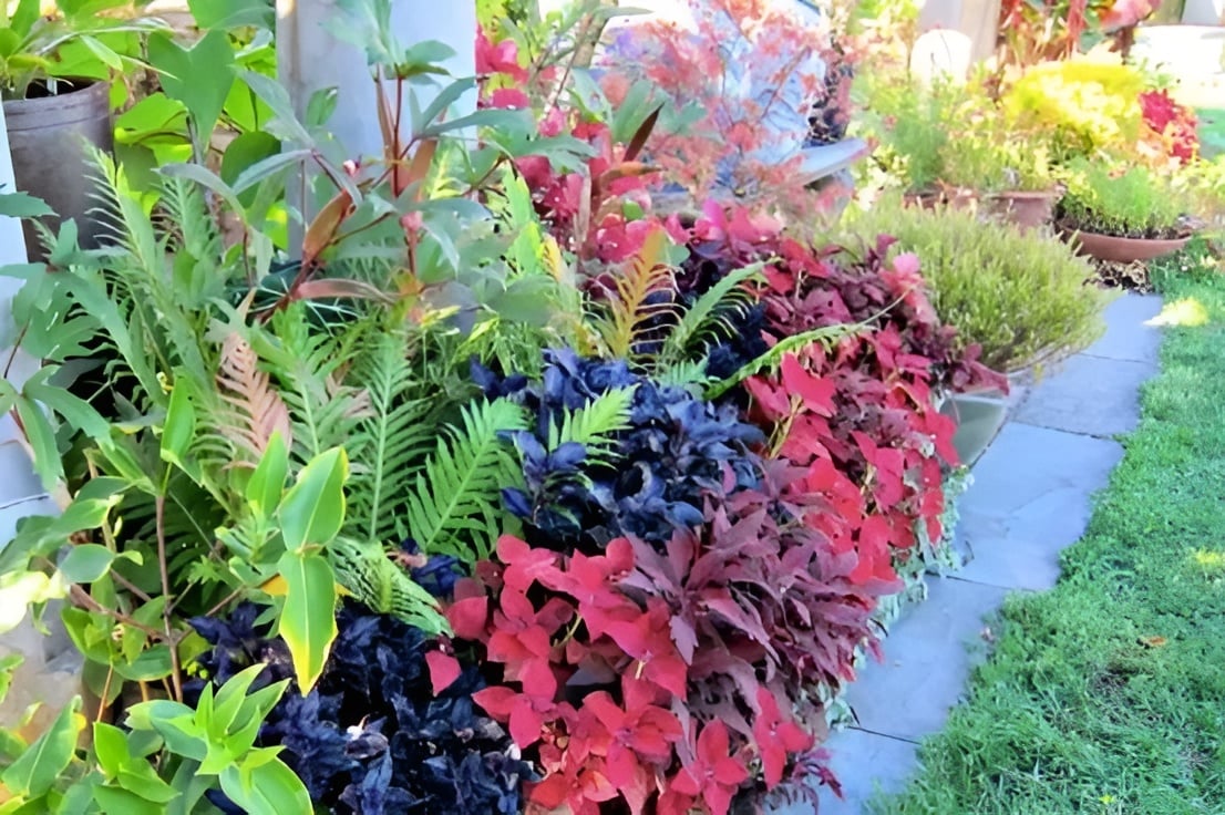 This autumn border garden was achieved with planning and research about the chosen plants. Border gardens can be designed with tall plants in the back, mid-sized plants in the middle, and smaller, low-growing specimens in the front at the edge. The plants in this vibrant bed include various Coleus (the front-of-the-border reds), ornamental okra (Abelmoschus esculentus), and red leaf tree fern (Blechnum brasiliense ‘crispum’).