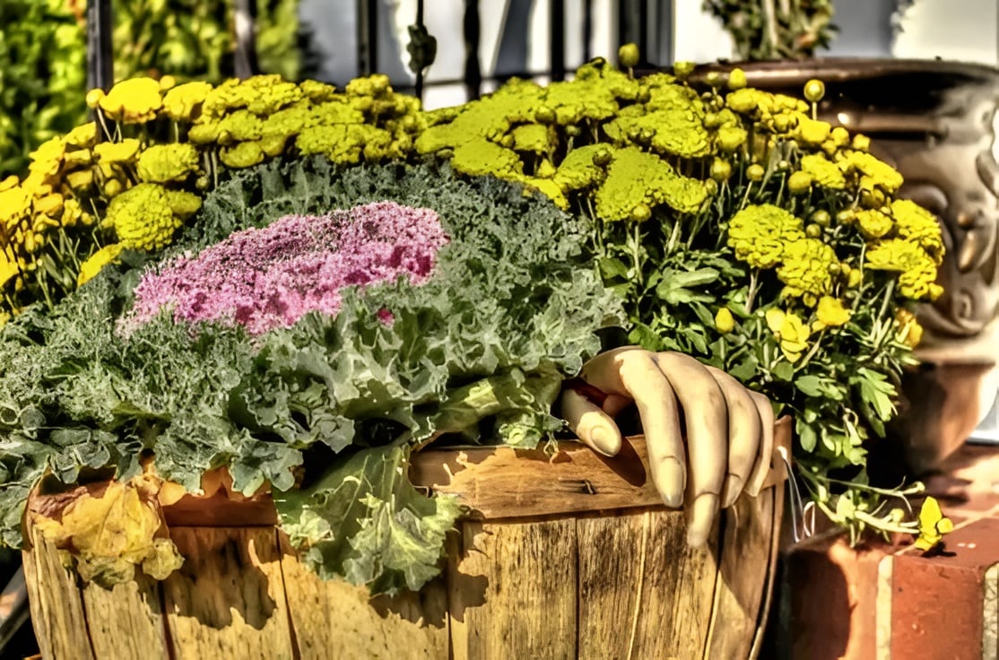 Do you need a hand to help you with fall porch decorations? Get a grip and give visitors a fright with a faux hand clawing its way out of a container garden.