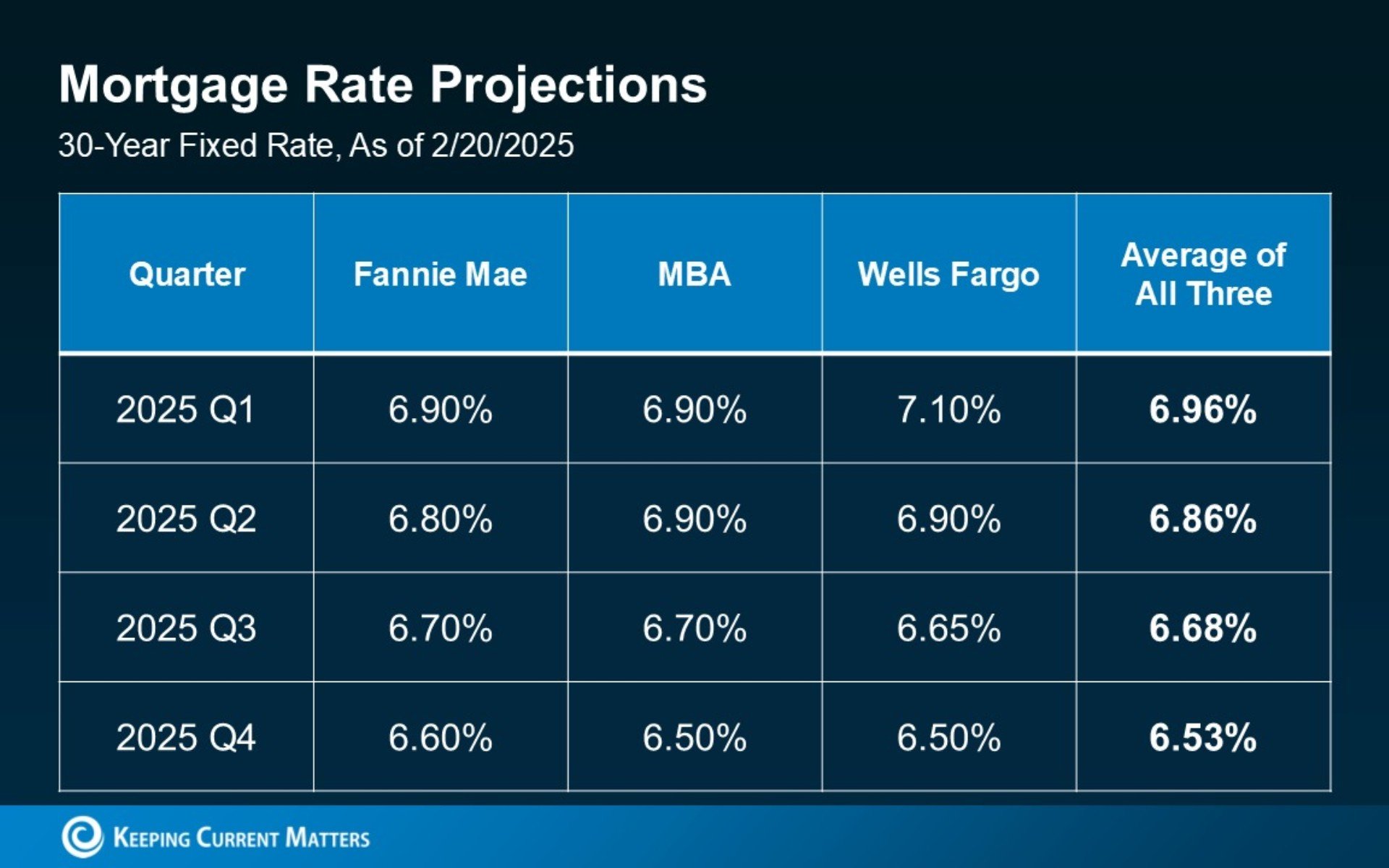 While mortgage rates are still expected to decline sometime later this year, projections from Fannie Mae, the Mortgage Bankers Association (MBA), and Wells Fargo now show them stabilizing closer to 6.5% by the end of the year (see below):