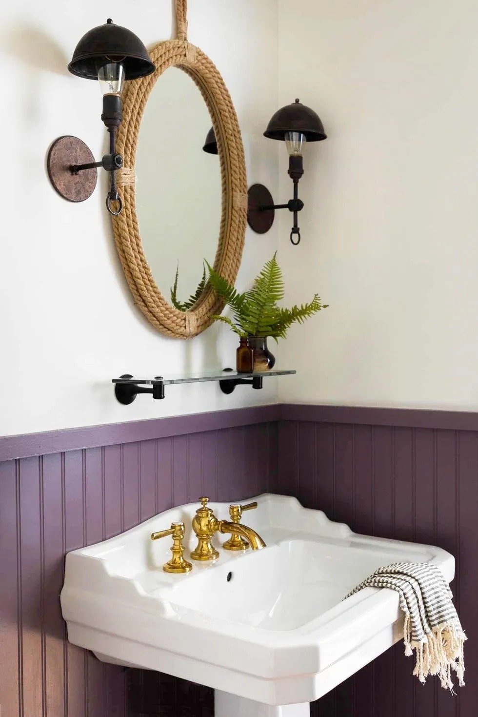 Color-blocking is a great way to play with color if you don’t want to cover the entire room in one experimental shade. Here, for example,a soft purple for below the chair line to give the rustic farmhouse-style bathroom a more romantic touch.