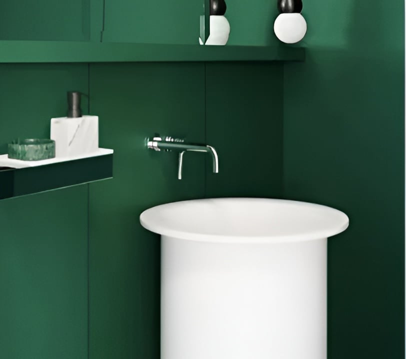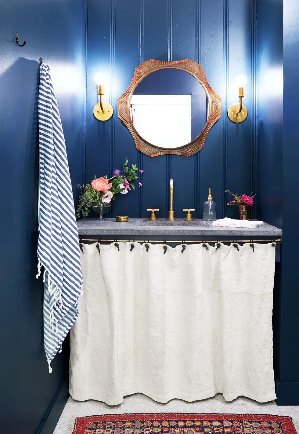 With a slim cylindrical sink and lone pendant light, this bathroom is perfectly proportioned. But since there’s no room for any decorative extras and even the essential pieces can’t take up too much space, the only way to make a power move design-wise is with a bold paint color.
