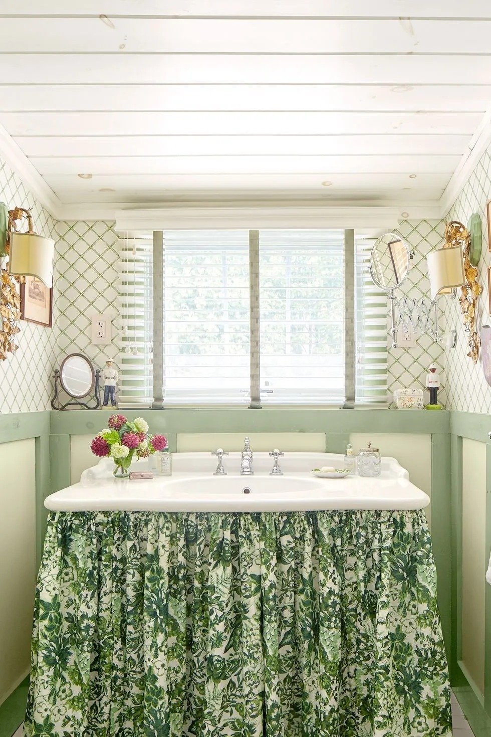 The floral skirted sink vanity and complementary painted green walls make every day feel like a fresh spring morning in this cheerful bathroom. The two tones of green paint speak to the many shades in the floral fabric skirt as well as the wallpaper.