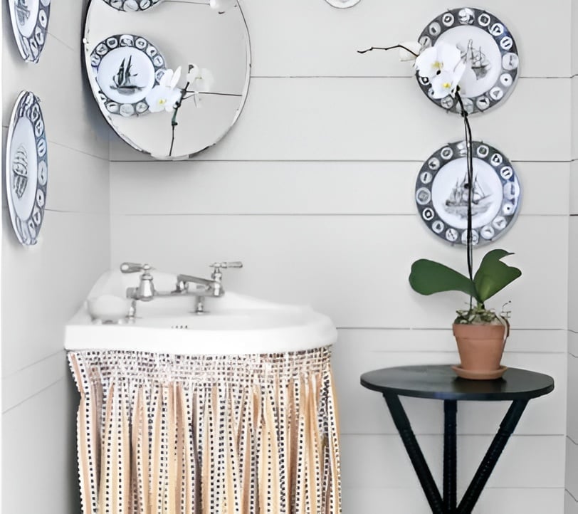 For a powder room this small, a mirror hung at an angle above a corner sink maximizes every inch (and clutter can be stashed behind the fabric skirt). The Wedgwood plates and round accent table help counteract the boxiness and add charm. To add a bit more polish and intrigue, the walls are painted in a light, soothing gray.
