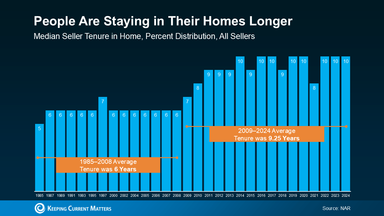 2. People Are Living in Their Homes Longer. Data from the National Association of Realtors (NAR), shows the average homeowner stays in their home for about 10 years now (see graph below):